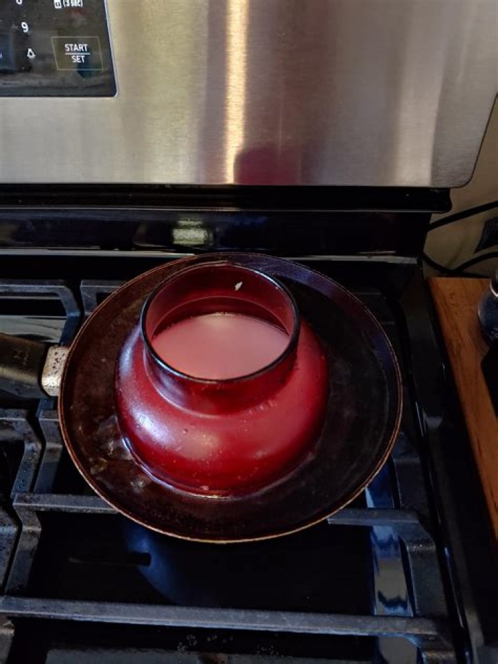 a pot of simmering waterLeave a little space at the top for a final splash of boiling water. Soy candles, for example, can be soaked in hot water that isn’t quite boiling.) Floating to the top will be the result of the wax melting as the water boils. Remove the wax by letting the water cool down.