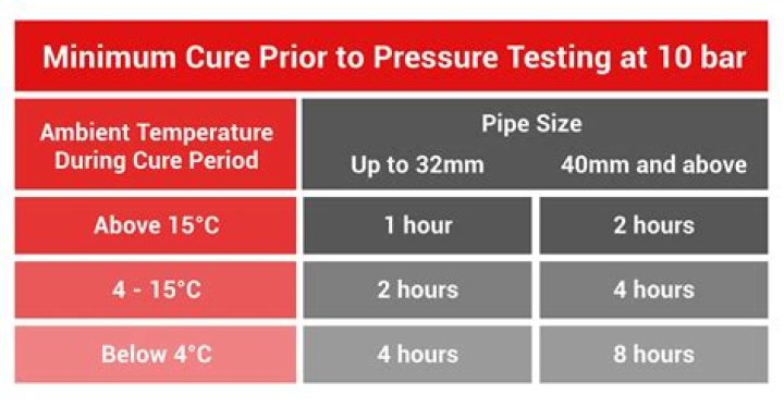 Before performing a pressure test up to 180 psi, allow for 15 minutes of good handling strength and 2 hours of cure time at temperatures above 60°F. Temperatures below 60°F and pipe diameters greater than 3 may necessitate longer cure times “For more information, please see the following link:
