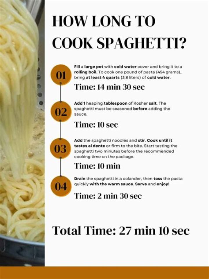 The best way to cook spaghetti is in a large pot of boiling water, and then draining it when tender, usually after 8–9 minutes. Some people recommend cooking pasta 1 minute less than its given time since overcooking will make the noodles too mushy.