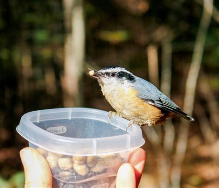 The birds will eventually eat from your hand if you leave them alone long enough. In a pinch, if the feeder is low or completely empty, place nuts and seeds in your palm and wait patiently for a taker to come along. Make sure you remain completely still and silent once a bird lands on your hand.