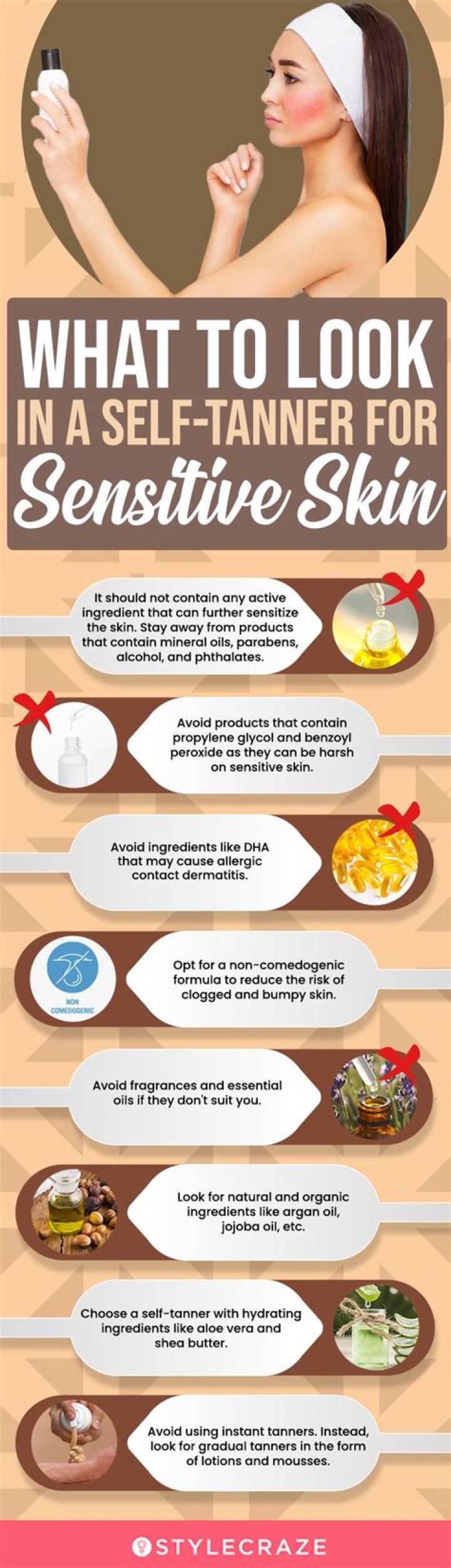 Even if you don’t have acne, using fake tan products like lotions and sprays can clog pores, make your skin oilier, and introduce bacteria to your skin, resulting in an acne breakout.
