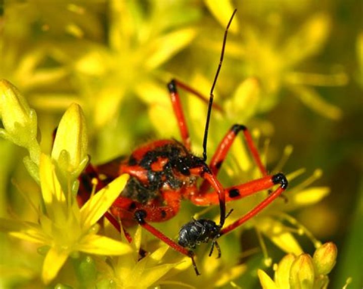Assassin bugs belong to the family Reduviidae. The known species of assassin bugs count up-to 7000 approximately. The narrow head of these assassin bugs is connected to the body with a thin neck-like structure. The curved beak present in the groove between the two legs is a characteristic of this specie of bugs. Some species are brightly colored and others are generally black or dark brown in color. Mostly assassin bugs live outdoors and make other insects their prey. While others survival depends on vertebrates including humans. They suck blood and transmit diseases in humans.