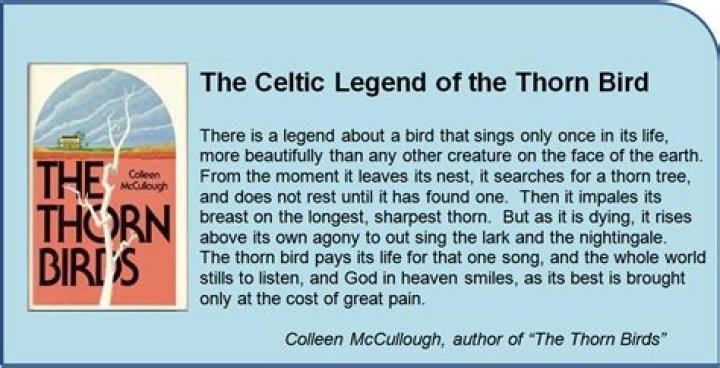 In the book’s title, the mythical “thornbird” is referred to as the one who begins searching for thorn trees as soon as it is born. If a perfect thorn tree can be found, it will sing a beautiful song before dying by being impaled on a thorn and dying.
