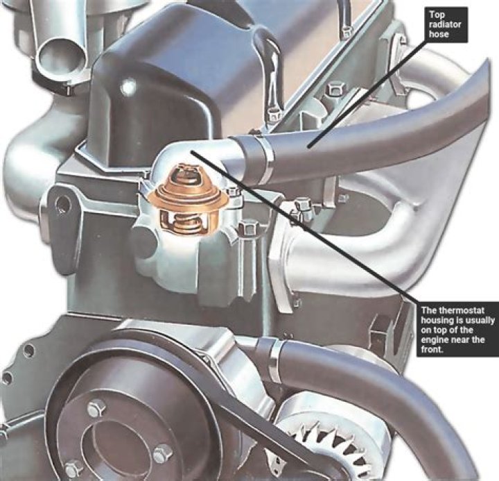 The lower radiator hose, where it meets the engine, is where you’ll find it.