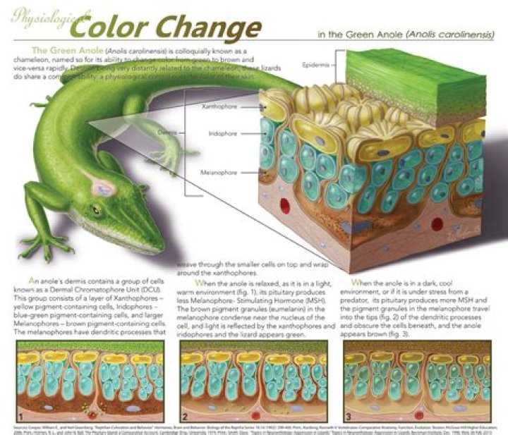 Because of their ability to go from green to brown and back again, anoles are frequently referred to as chameleons. Hormones are responsible for the color shifts, which can be triggered by temperature, the color of the background, or even mood. Pituitary gland hormone intermedin is responsible for these changes.